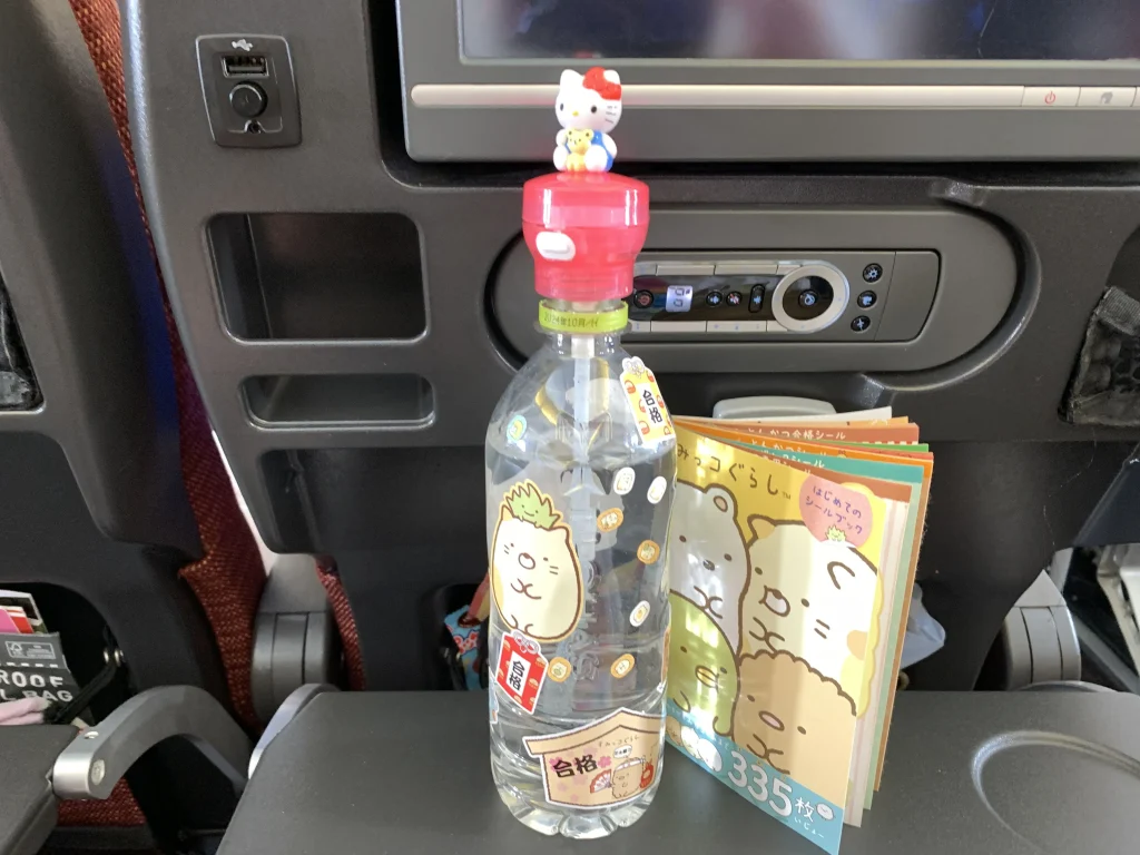飲み物については、飲み終わったら捨てられるように500mlペットボトルを(機内持ち込み分は空港の保安検査場を通過した後で)購入しましょう。別途、飲み口&ストロー付きのキャップを持参しておくのがお勧めです。私はこれを使っています!👇