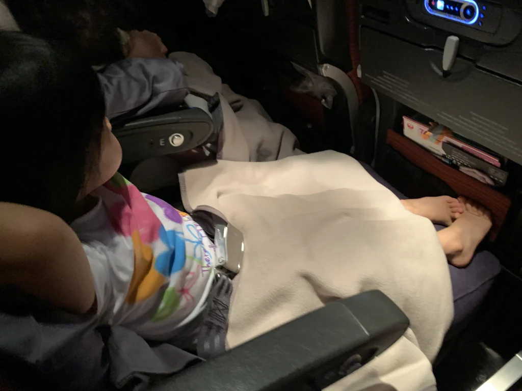 - あとはシールブック遊び・トイレ・座席スクリーンでディズニー映画・お菓子&飲み物、これらを繰り返しつつ、気付いたら映画を見ながら寝ている、というパターンが理想です。