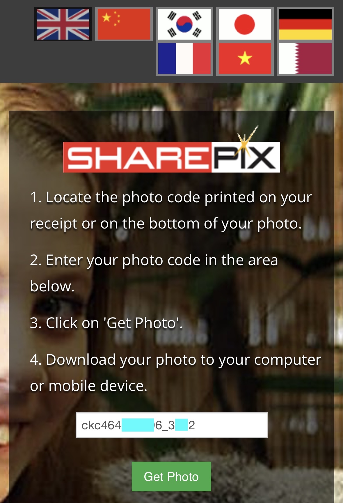 ②フォトコード(プリントされた写真の左下に表記されています)を入力し、[Get Photo」をタップ。