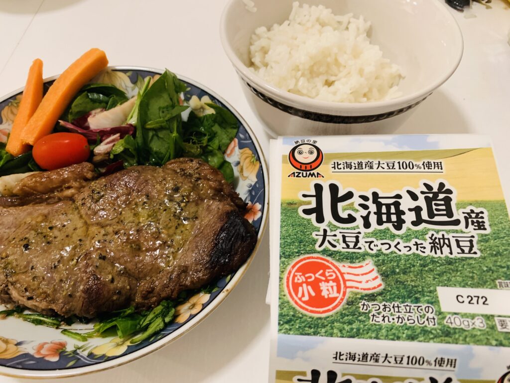 ⏬全く映えない料理写真ですが、やっぱりオージービーフは美味でした😋納豆は別の店で買った物です。
