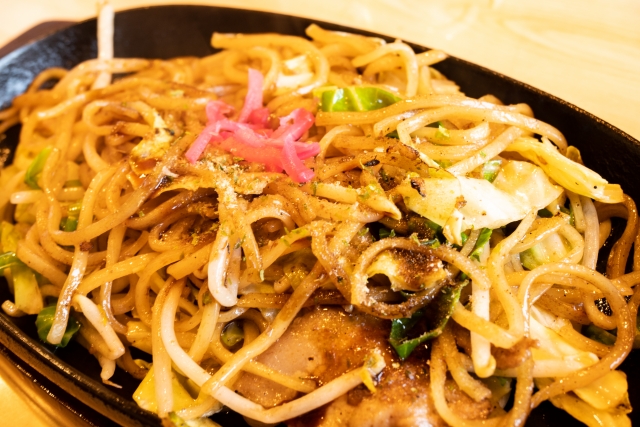 This regional style of yakisoba is known for its thick, chewy noodles, cabbage, pork, and savory sauce, often topped with fish powder.