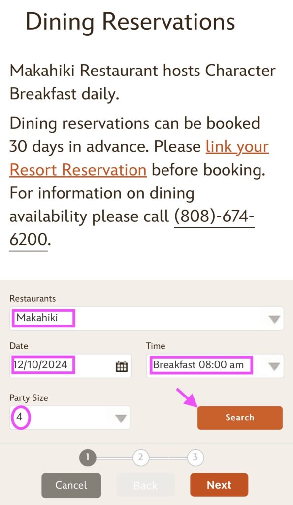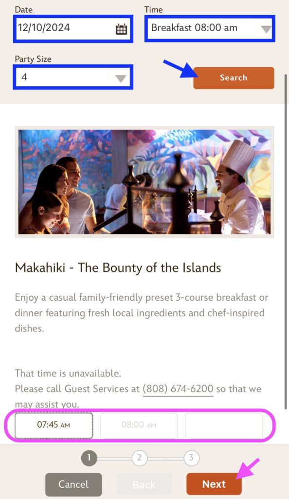 🔽予約の空きを検索する画面です。Restaurantsは”Makahiki”を選択、Dateに日付、Timeに希望の時間、Party Sizeには(子どもを含めた)人数を入れ、空きがあるか確認します。