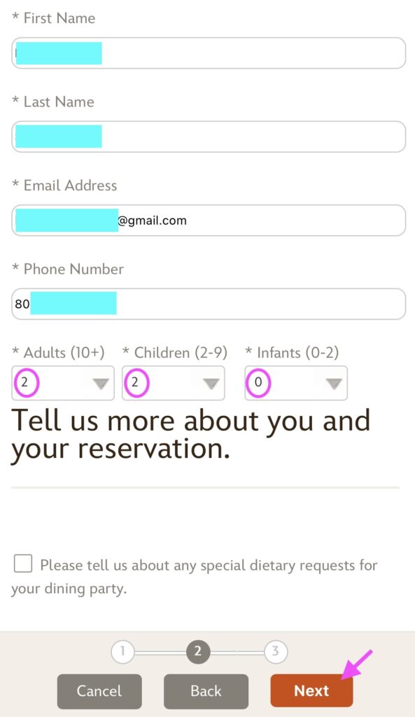 🔽予約画面では、氏名とEmailアドレス、電話番号が必要になります。電話番号は先頭のゼロを取って入力、人数は大人・子どもの内訳を入力します。その下には、アレルギーの有無、車椅子や子供用椅子(ハイチェア)のリクエスト、誕生日・記念日・新婚旅行などの情報をレストラン側に伝える項目が続きます。