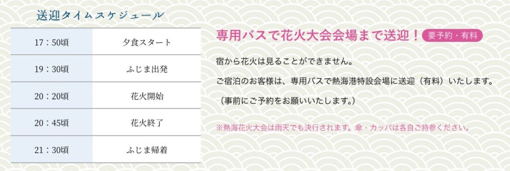 さらに、全国的に有名な熱海の花火大会が開催される日には、会場まで行ける予約制の送迎サービスがあるようです。(有料)