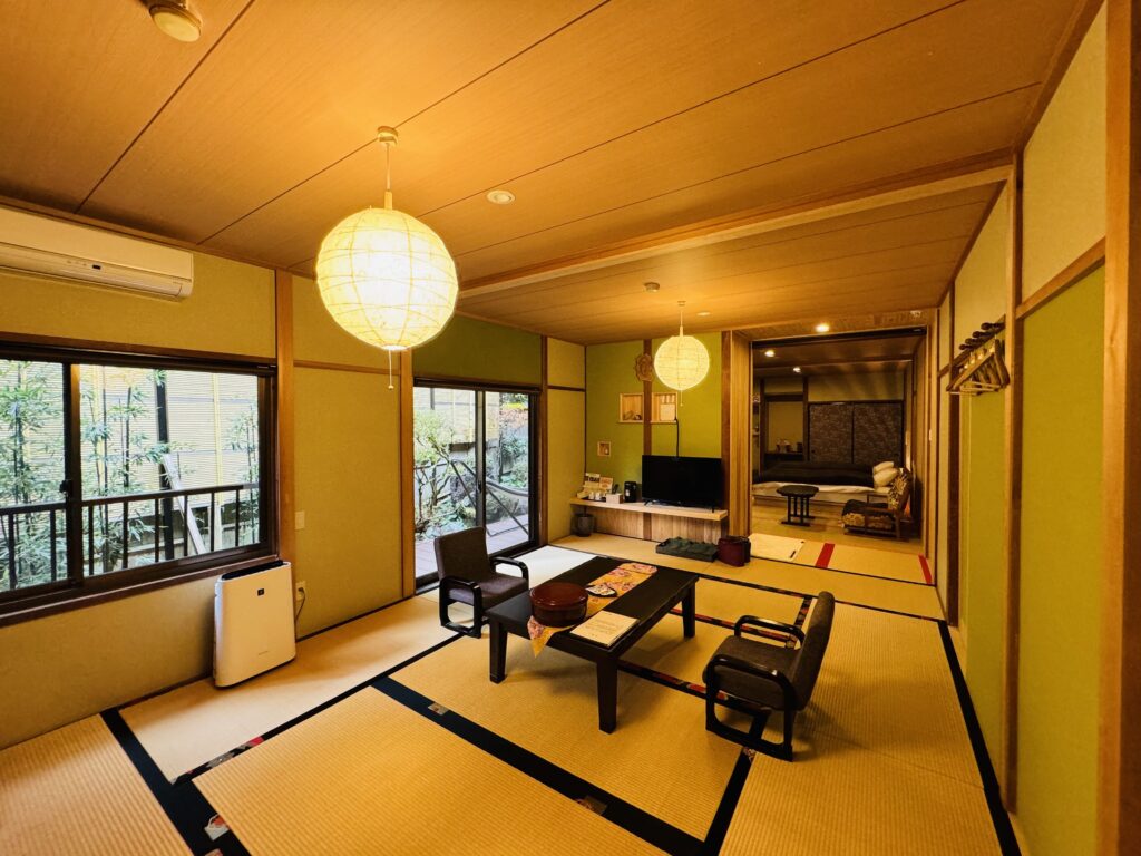 【特徴】和の趣が詰まった特別な部屋で、2021年にリニューアルされたばかり。1階フロアにある唯一の客室なので、元気な子供が走り回ってしまったり、多少騒がしくても周囲が気になりにくい。客室は十分すぎるくらい広い作りで、ロールカーテンで二間に仕切ることも可能。トイレと洗面所が2箇所ずつあるので、両親を連れての親子孫3世代で一緒に利用するのにも向いています👍