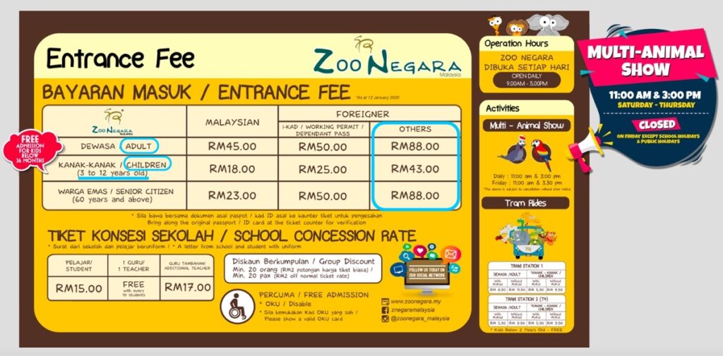 ⏬私達のように外国からの普通の観光客なら、大人88RM・子供43RM(0~2歳の子供は無料)となります。