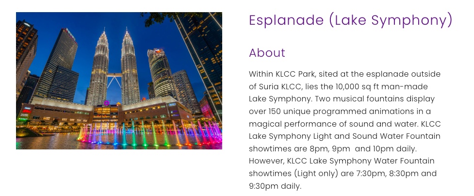もちろん、KLCCのどこで遊んでいても1日中楽しめるほど充実していますが、毎日夜にKLCC公園で行われる噴水ショー“レイクシンフォニー”と、輝きながらバックにそびえ立つペトロナスツインタワーの夜景は格別です。